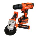 Super Pack de Amoladora + Taladro. AMOLADORA ANGULAR LITIO: Potencia: 20 V. Velocidad: 7500 rpm. Diametro del disco: 4-\" (115 mm). Accesorios: Mango auxiliar y Disco abrasivo de 115 mm. TALADRO DE LITIO: Potencia 20 V. Velocidad sin carga: 0-350 / 0-1350 rpm. Mandril: 3/8\" (10 mm) sin llave. Ajuste de torsion: 18+1+1+1. Cap. max. de perforacion: Acero: 10 mm | Concreto: 10 mm | Madera: 18 mm. Funciones: Apta para brocas de doble extremo y luz LED. Incluye: Gancho para cinturon, Bateria de litio de 3.0 mAh y Cargador rapido de 2.0 A.