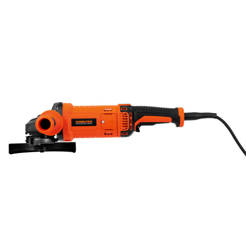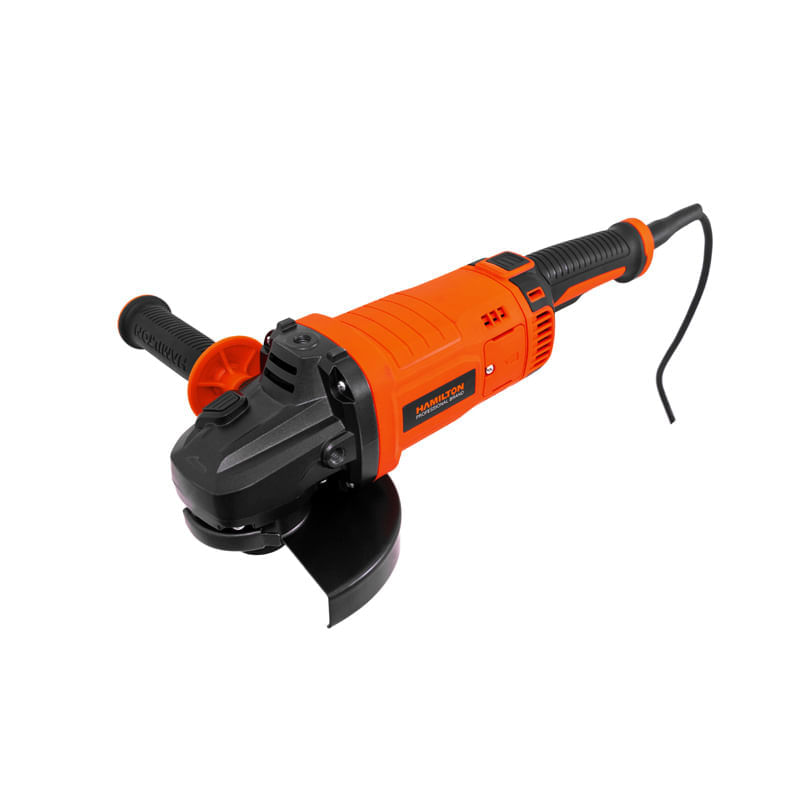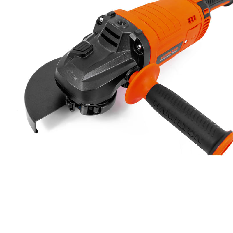 Amoladora angular. Motor electrico brushed de alta performance. Mango anti-vibracion 3 posiciones. Para discos de 230mm. Caja de engranajes de aluminio. Motor potente con arranque progresivo. Tension nominal 220-240V. Frecuencia 50Hz. Potencia de entrada 2350W. Velocidad sin carga 6500 rpm. Protector de ajuste rapido. Mango con grip. Incluye mango auxiliar, llave extractora y protector de disco.
