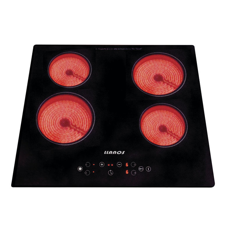Anafe elecrtico vitroceramico. Sistema de calor: resistencias electricas. Superficie vitroceramico. 4 Zonas de coccion. Comandos touch. Montaje: Perforacion 57x50. Consumo energetico 6000W.