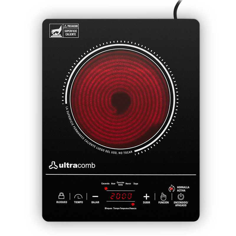Anafe electrico vitroceramica. Consumo energetico 2000W. Sistema de calor infrarojo. Superficie vitroceramica (vidrio templado). Exclusivo diseno de superficie lisa, sin marco. Pantalla LED. 1 Zona de coccion. Encendido electronico. Comando electronico multitouch, sin teclas ni perillas. Aviso de hornallas calientes. Seleccion de tiempo y temperaturas. Temperatura regulable mediante termostato. Sistema de vision de areas calientes. Instalacion sobre mesada. Apoyos antideslizantes. Ideal para casas u oficinas. Optimo rendimiento. Facil de usar. No requiere instalacion.