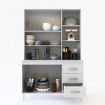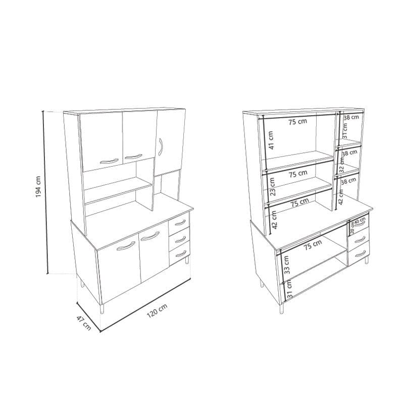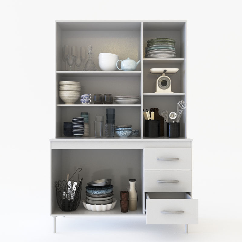 Kit de cocina alfa 1,20 5 puertas y estantes. 3 cajones con correderas metalicas. Melamina de 15mm. No Incluye vajillas de ceramicas, fuentes, adornos ni vasos. Las fotos son ambientadas e ilustrativas.