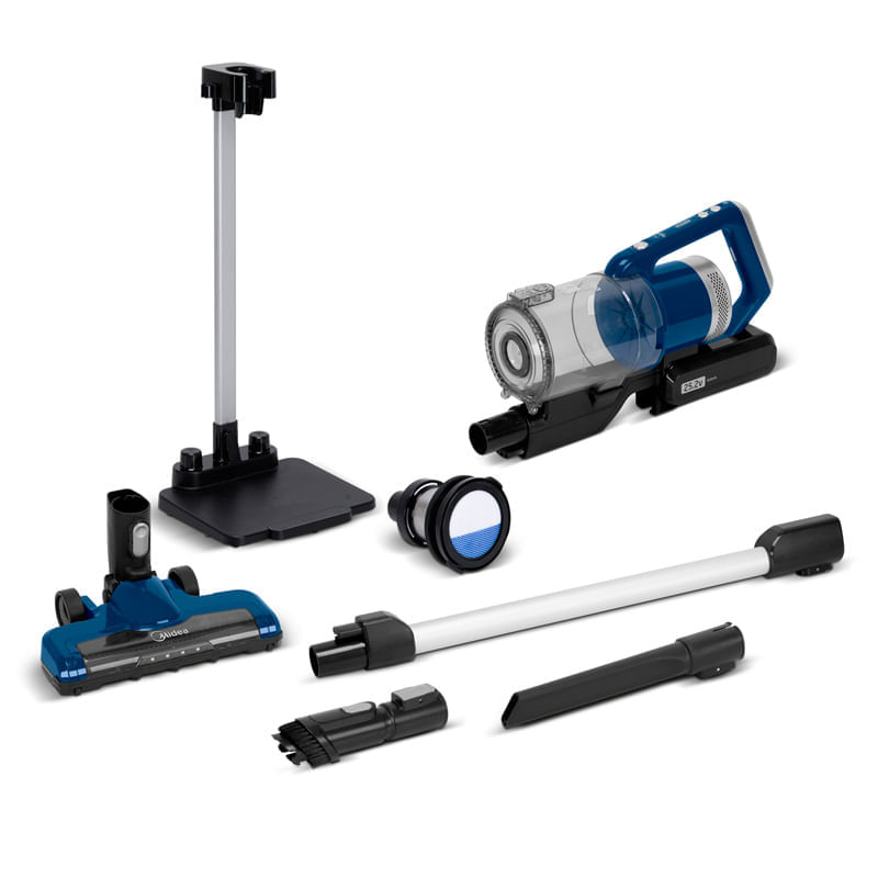 Aspiradora inalambrica Stick 2 en 1. Potencia 150W. Voltaje 25.2v. Capacidad de succion 28W. Tiempo de operacion max 17min - normal 45min. Capacidad de bateria 2000 mAh. Tiempo de carga 4-5h. Filtro de salida esponja. Capacidad de recipiente 0.3L. Ajuste de potencia. Base con soporte, accesorios para grietas, accesorio con cepillo. Luces LED en cepillo. Cepillo motorizado. 1 Click para vaciar recipiente. Recipiente y filtro lavables. Material de tubos: aluminio. Nivel de ruido 82 db.