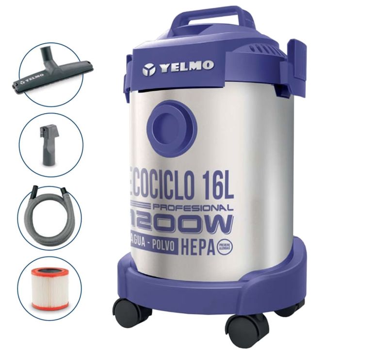 Aspiradora sin bolsa. Potencia 1200W. Capacidad 16L. Tipo: Tambor plastico. Tipo de tubos: Plasticos. Apta para aspirar agua y polvo. Filtro lavable H.E.P.A. Set de boquilla y cepillo para piso/alfombra. Alimentacion 220V.