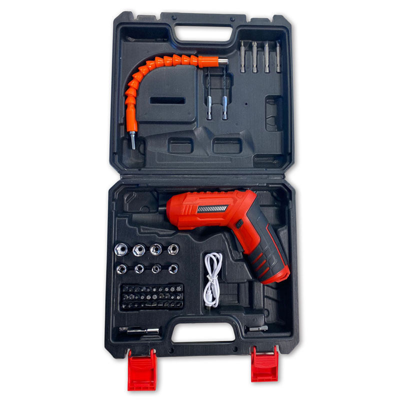 Atornillador Inalambrico con valija. Potencia: 4V. Capacidad de la bateria: 1500mAh. Velocidad de carga: 250rpm. Maximo torque 3.5N.m. Incluye diferentes puntas adaptables. Cable de carga USB (no incluye adaptador para enchufe pared).