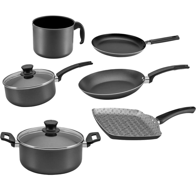Bateria de cocina 6 piezas. El juego de sartenes antiadherentes Panelux Classic de 6 piezas esta fabricado en aluminio con revestimiento interno y externo antiadherente. Posee un mango de baquelita resistente al calor que garantizan la seguridad durante el manejo y evitan quemaduras. Tapa de vidrio templado con ventilacion de vapor y borde de acero inoxidable. Incluye: 1 Bifera Rectangular 24 cm. 1 Sarten 24 cm. 1 Panquequera 22 cm. 1 Cacerola con mango y tapa de vidrio 16 cm. 1 Cacerola con asas y tapas de vidrio 24 cm. 1 Jarro hervidor 12 cm.