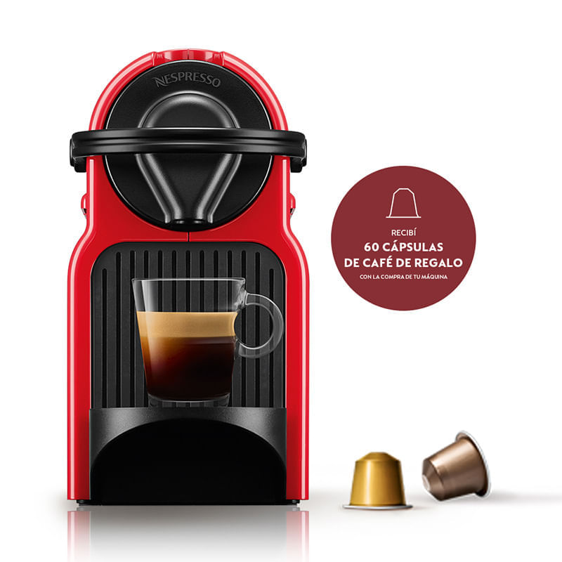 Maquina de cafe Nespresso Inissia Red. La maquina de cafe Inissia ha sido concebida para ofrecer la maxima eficiencia de uso y toda la calidad de Nespresso. Diseno compacto y divertido. La maquina Inissia de Nespresso, que se caracteriza por su reducido tamano, su diseno compacto y ligero y su asa ergonomica, se adapta perfectamente a cualquier configuracion interior. Espresso y Lungo. Casi no hay que esperar a que la maquina se caliente para seleccionar el cafe deseado. Con solo pulsar un boton y en 25 segundos, el agua alcanza la temperatura ideal para preparar hasta nueve cafes sin necesidad de rellenar el deposito de 0,7 l. Posee dos botones programables (Espresso y Lungo). Compacta y liviana. Uso exclusivo con capsulas Nespresso. Presion 19 bares. Rapido calentamiento. 2 Botones programables para cafe express (40ml) o lungo (110ml). Apagado automatico tras 9 min.de inactividad. Bandeja antigoteo rebatible. Deposito de agua extraible. Capacidad del contenedor de capsulas: 9 a 11. Energia electrica requerida: 220-240 V, 50/60 Hz.