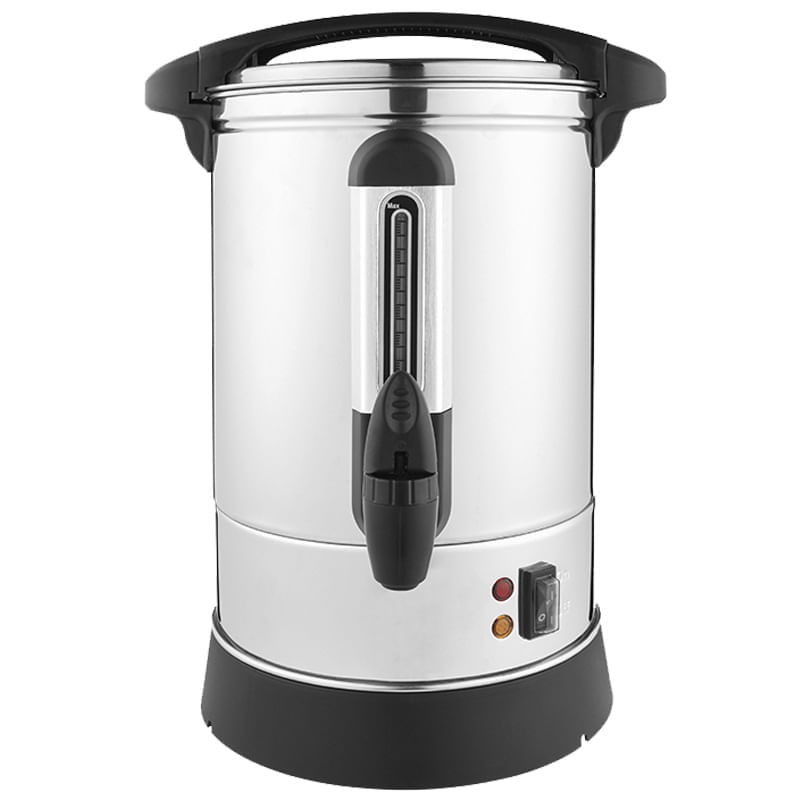 Cafetera automatica de filtro. Capacidad de 6.85 litros / 45 pocillos. Litros totales: 8. Litros infusion: 6,85. Para cafe, mate cocido, agua caliente y te en hebras. Grifo bidireccional para desagote total o parcial. Filtro de acero inoxidable removible y facil de limpiar. Corte automatico y mantenimiento de temperatura. Interior y exterior de acero inoxidable. Indicador de nivel a la vista. Doble pared de acero inoxidable. Indicadores luminosos de preparacion y servicio. Tecla de apagado y encendido..Especificaciones electricas: Tension: 220V - 50Hz. Potencia: 950W.