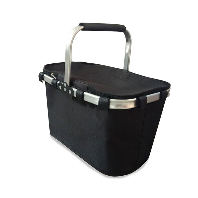 Canasta. Posee un marco de aluminio con manija rigida del mismo material con grip de goma antideslizante para un mejor agarre, cierre metalico. Interior con cooler de aluminio, 2 varillas internas para asegurar su altura y que no se pliegue al usarla. Es facil de plegar para guardar y transportar. Medidas: 40 cm x 23 cm x 22cm. Material: Polyester, aluminio y nylon.