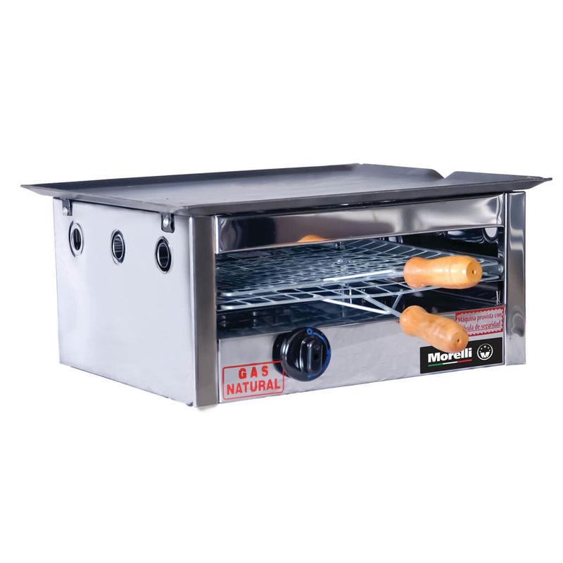 Carlitero simple a gas. Gabinete de acero inoxidable. Plancha de chapa 3.2mm. 1 Quemador. 1 Pinza. Comandos a perilla. Bandeja antidesborde. Colector de grasa. Calorias 4472. Valvula de seguridad. Gas natural.