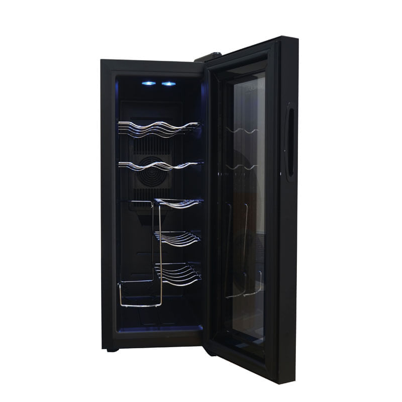 Cava con sistema de enfriamiento termoelectrico. Capacidad 12 Botellas (4 botellas paradas / 8 botellas acostadas). Puerta de vidrio espejado. Control de temperatura touch (10-18C). Luz azul interna. Digital. Silenciosa. Ausente de vibraciones. Voltaje 220-240v AC. Frecuencia 50Hz. Consumo de energia 0.273KWh / 24h. Corriente 1.0 A (25C). Clase climatica SN. N. Agente espumante Cyclopentane.