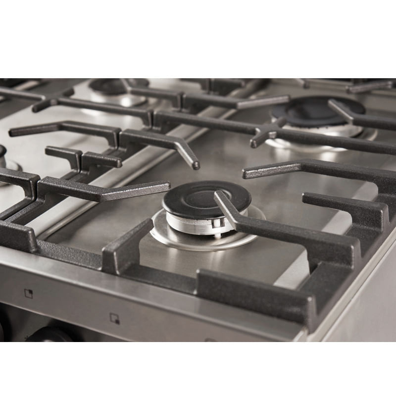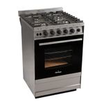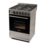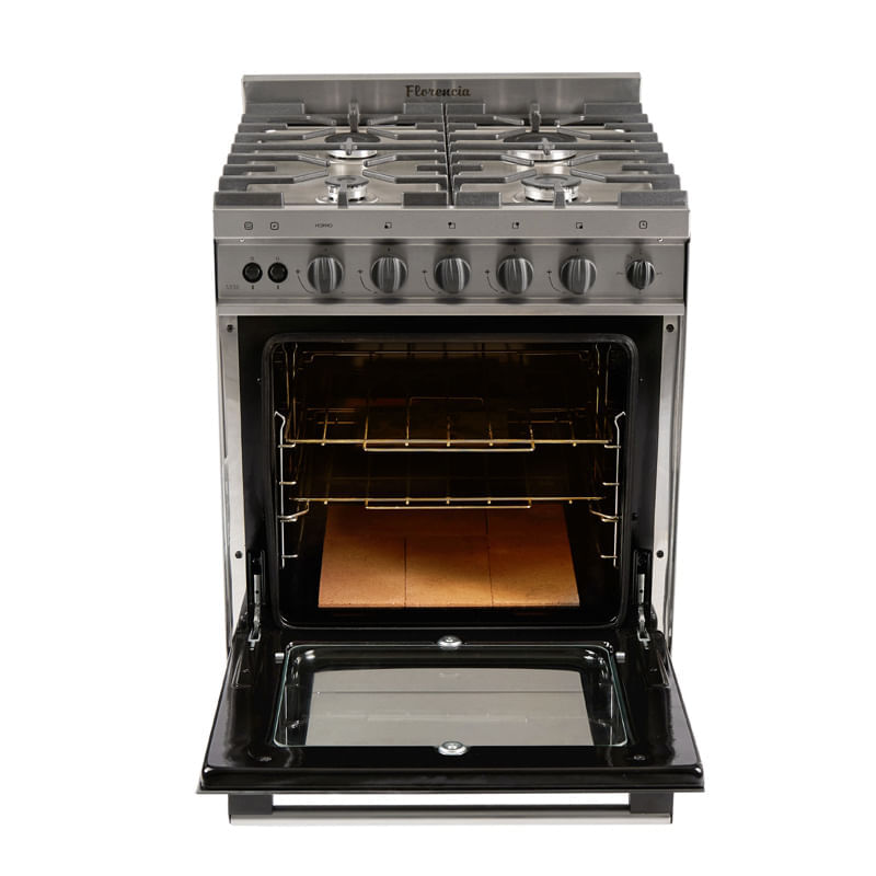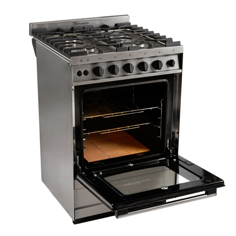Cocina Gastronomica totalmente de acero inoxidable. Puerta de horno con doble vidrio templado. Valvula de seguridad en horno. Piso de horno con ladrillo refractario. Enlozado de horno easy clean. Rejillas de horno extraible con la apertura de horno. Luz en horno. Encendido electrico de horno y hornalla. Rejillas antivuelco de fundicion divididas en dos para hornallas. Timer. Sistema multigas o bigas, 56 cm de ancho.