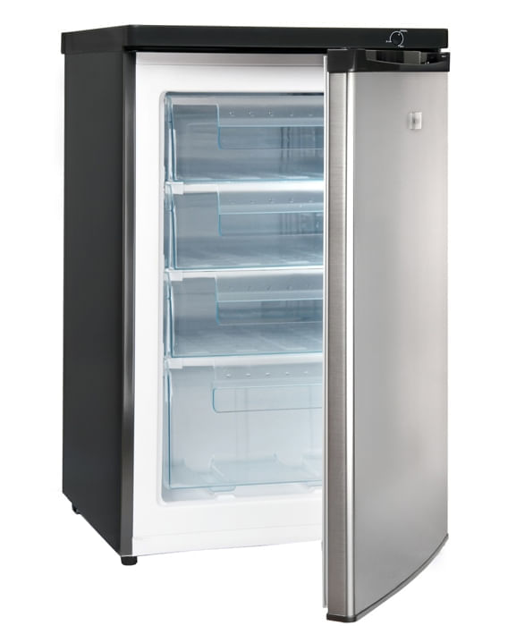 Freezer vertical de 92L de capacidad. Frente de acero inoxidable. Puerta reversible. Clase Climatica ST. Clase energetica A. Gas refrigerante R600a. Consumo energetico kWh/ano:230. Star Rating 4*.