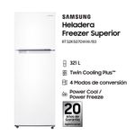 Heladera No Frost. Volumen Neto 321Lts / Volumen Bruto 330Lts. Sistema de enfriamiento: No Frost. Freezer superior. Eficiencia Energetica: A+. Twin Cooling Plus. Compresor Digital Inverter. Controles a perilla. Estantes vidrio templado. Cajon p/frutas y verduras. Desodorizante. Luz LED interior.