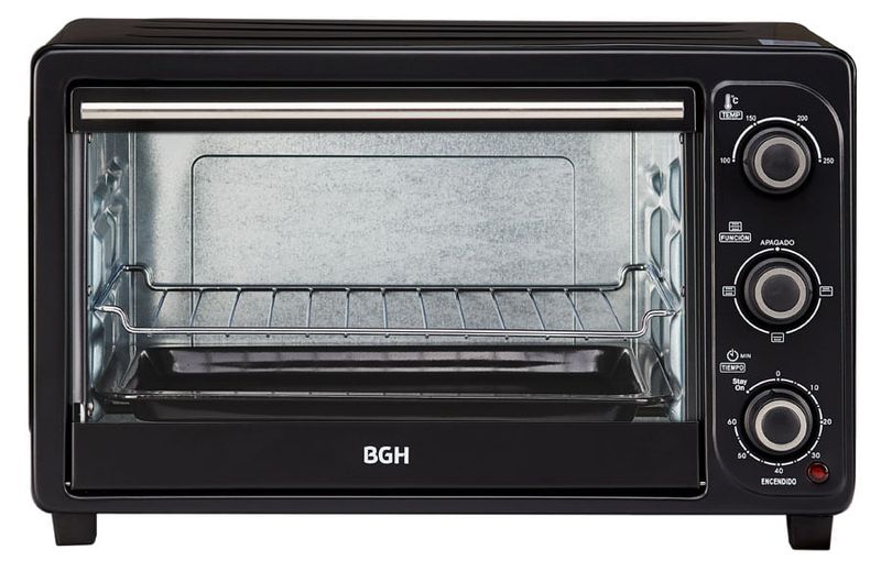 Horno electrico. Capacidad 16Lts. Potencia 1200w. Rango de temperatura 100 a 250C. Termostato. Timer. Estante regulable. Gabinete metalico. Controles: perillas.