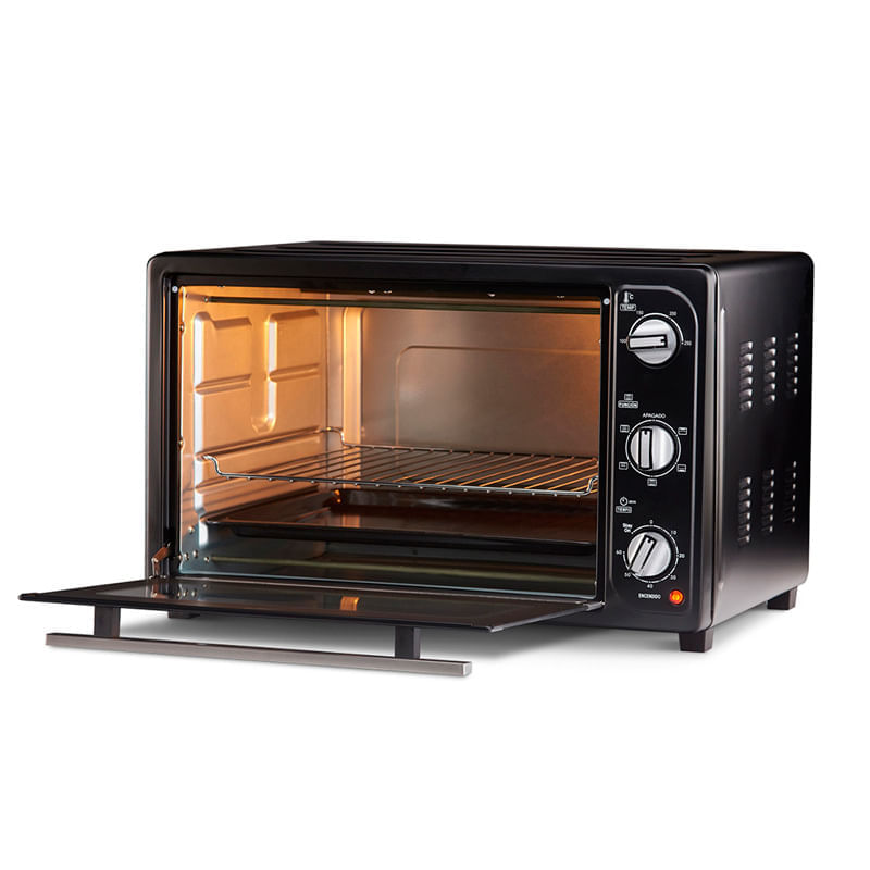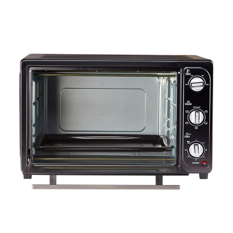 Horno electrico. Potencia 2000W. Capacidad bruta: 55L. Capacidad util: 37L. Termostato. Timer. Gabinete de acero. Grill. Controles mecanicos. Funcion conveccion. Estante regulable. Rango de temperatura 100 a 250C.