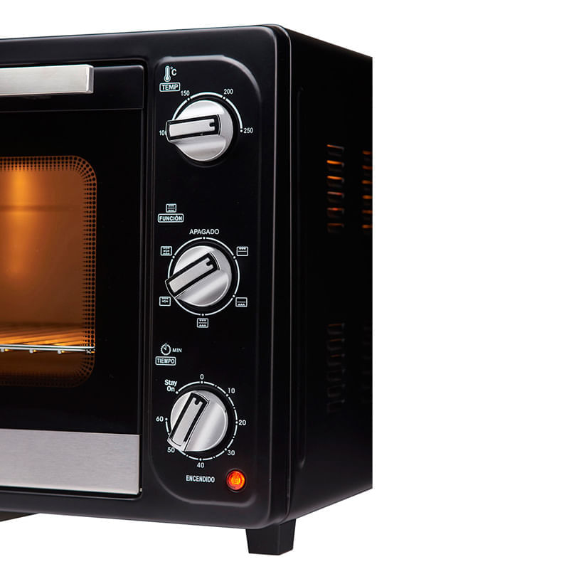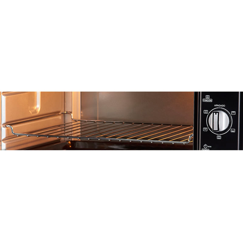 Horno electrico. Potencia 2200W. Capacidad bruta: 65L. Capacidad util: 62L. Termostato. Timer. Gabinete de acero. Grill. Controles mecanicos. Funcion conveccion. Estante regulable. Rango de temperatura 100 a 250C.