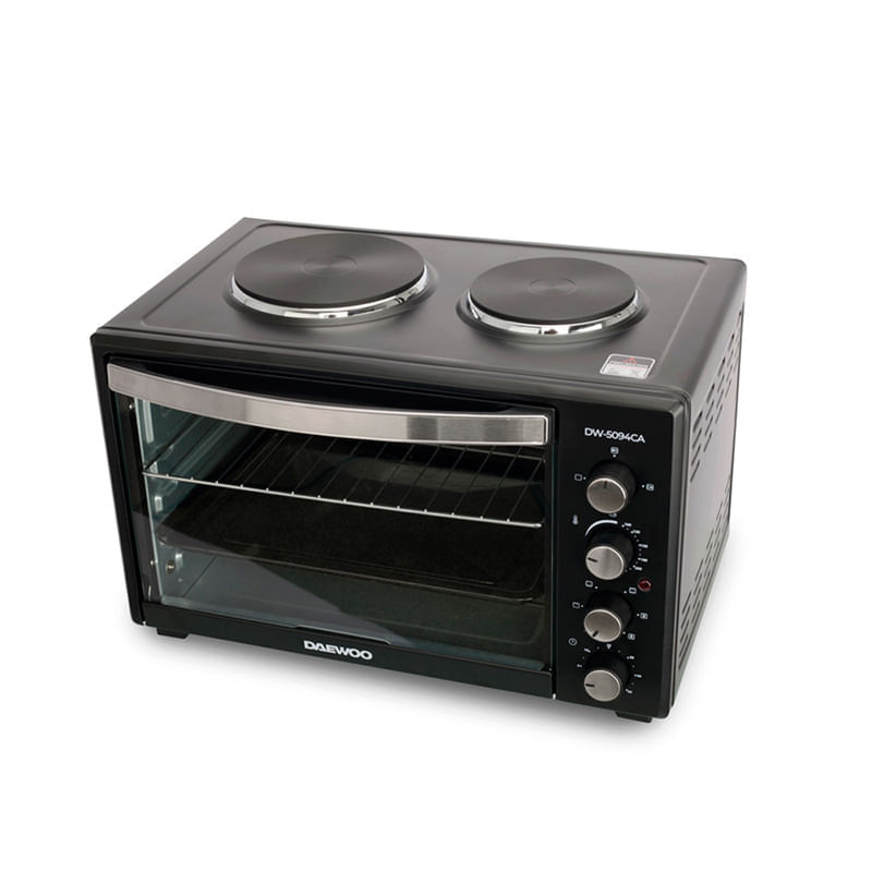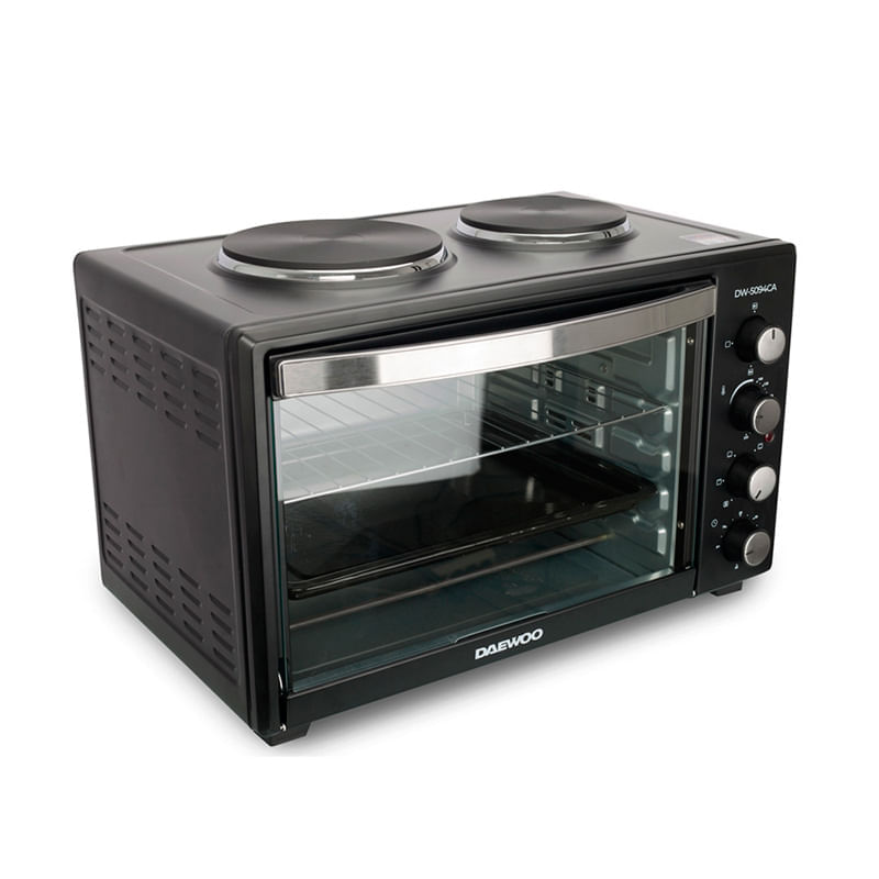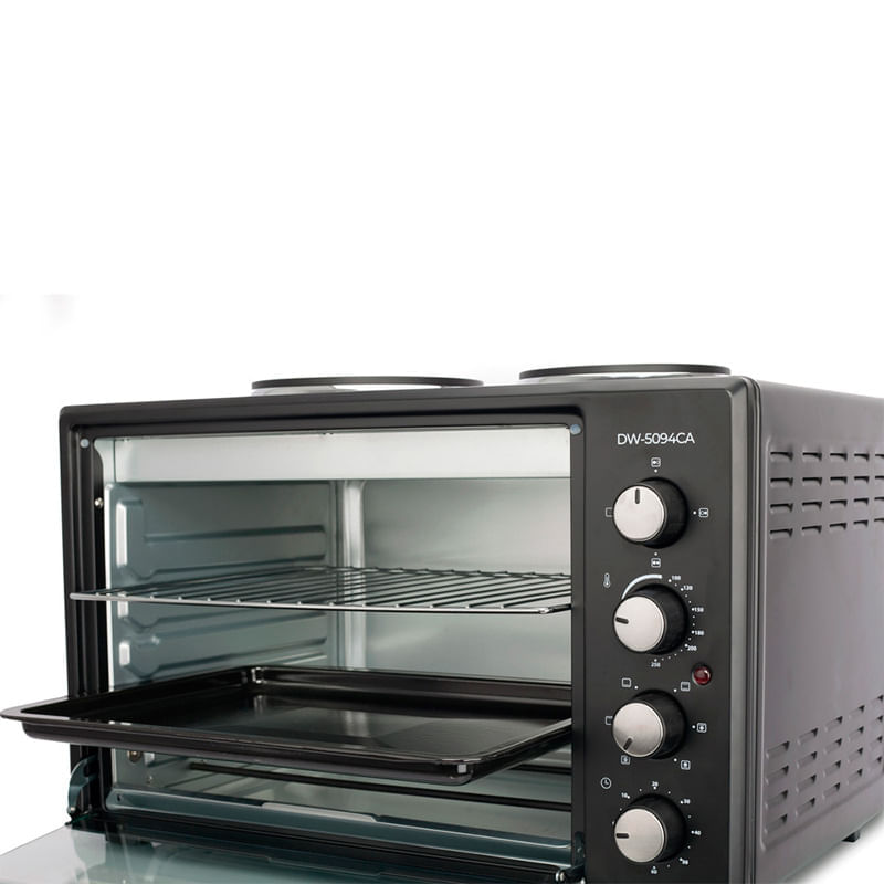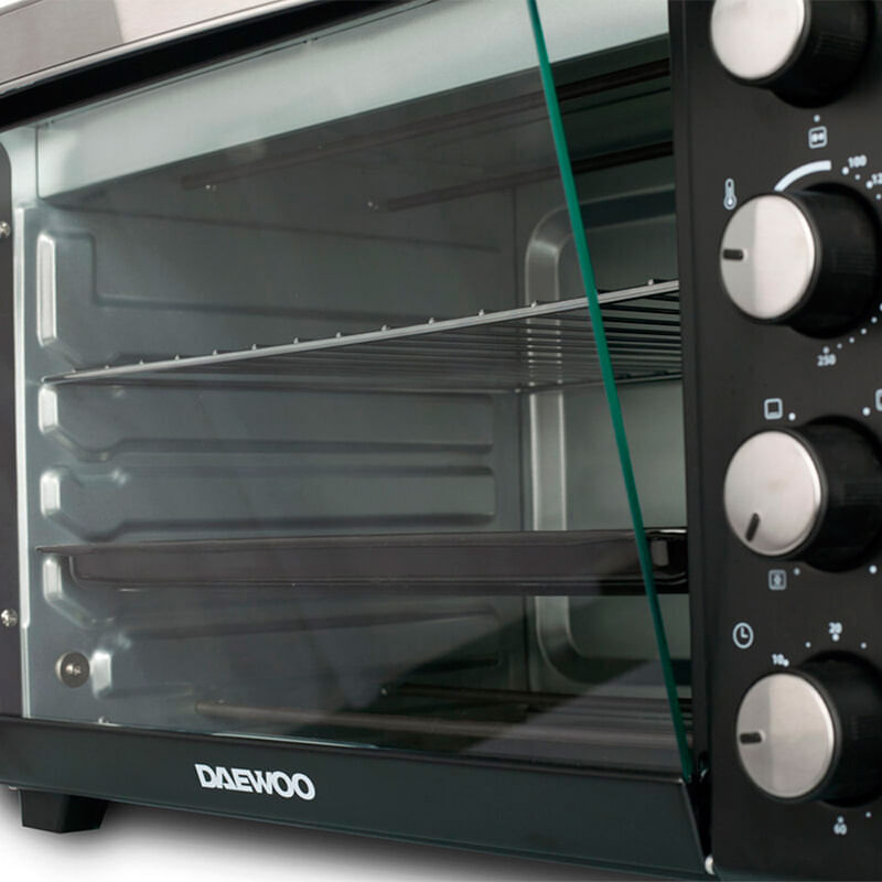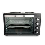 Horno electrico con doble anafe. Capacidad util 41 Litros. Capacidad bruta 55 Litros. Potencia 2000w. Seleccion de tipo de coccion. Timer de 60 min. Funcion conveccion. Temperatura maxima 250C. Accesorios: bandeja asadera, rejilla, pinza, bandeja recoge migas.