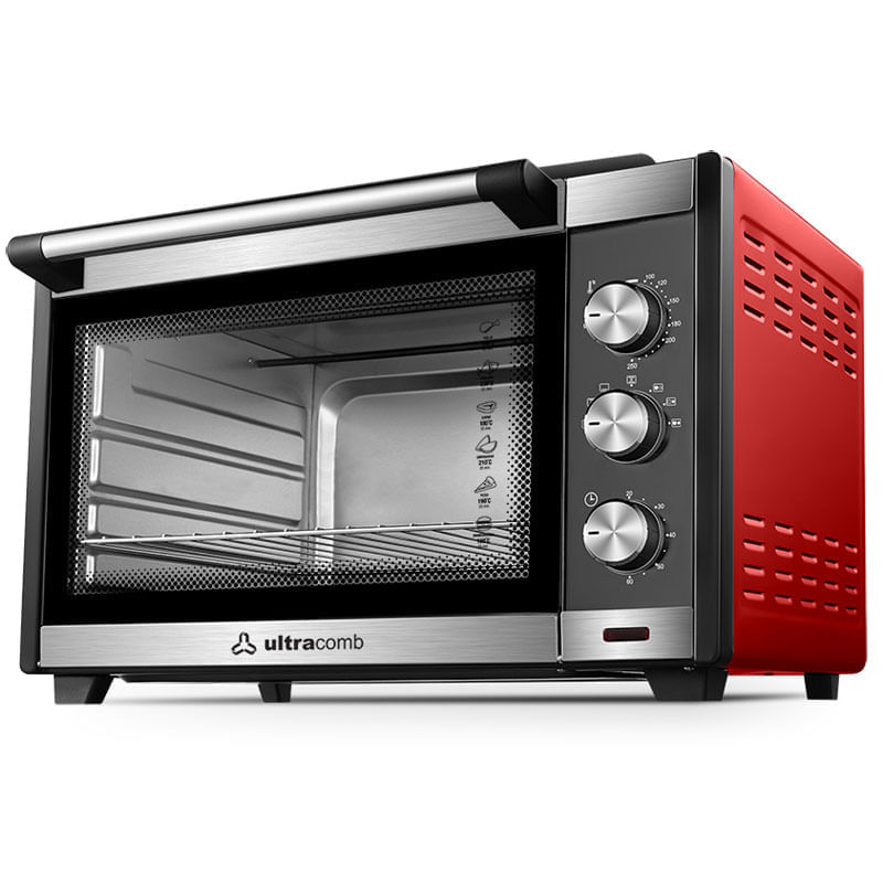 Horno Electrico. Potencia 2000W. Capacidad bruta: 55L. Capacidad util: 41L. Doble Anafe superior. Senal luminosa de encendido. Asa ergonomica en acero inoxidable. Selector de control de temperatura 100 a 250C. Selector para tipo de coccion. Temperatura de coccion homogenea mediante conveccion. Temporizador de 60 minutos con alarma sonora. Bandeja, Soporte rejilla, y pinza para extraccion. Selector independiente para cada hornalla. Hornalla grande: 1000W (diam: 18 cm). Hornalla chica: 800W (diam: 15 cm)