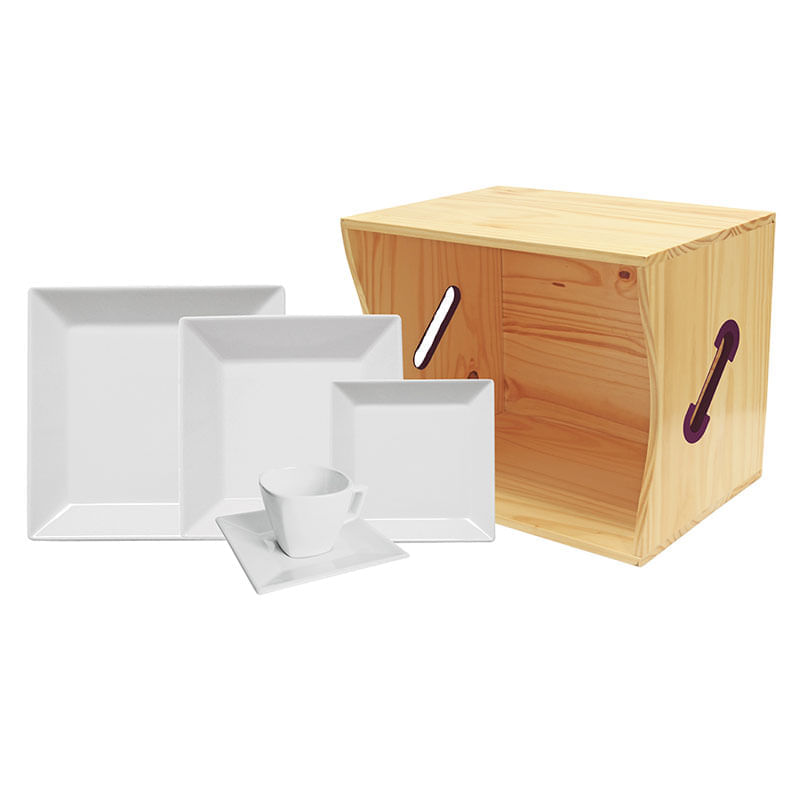 Juego de platos. El set esta compuesto por 30 piezas: 6 Platos playos 26.5cm. 6 Platos hondos 21 cm. 6 Platos de postre 20 cm. 6 Tazas para te 200 cc. 6 Platos para las tazas de te. Apto para lavavajillas y microondas. Material: Porcelana. Viene en cajon de madera.