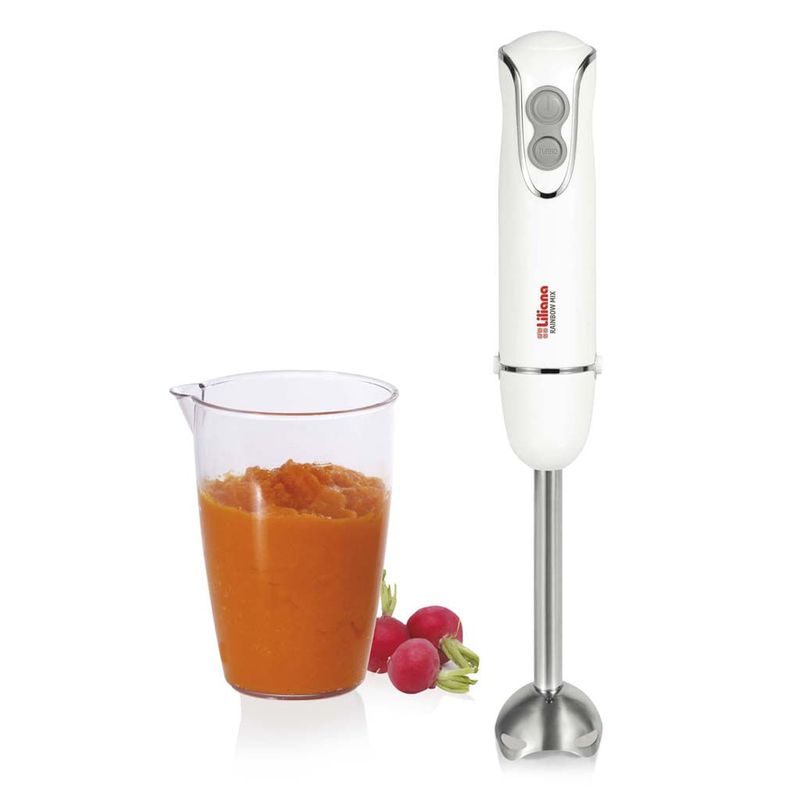 Batidora mixer. Potencia 450wts. 2 Velocidades. Varilla de acero inoxidable con cuchilla. Vaso medidor para batir jugos y aderezos con capacidad de 600 cm3. Color blanco.