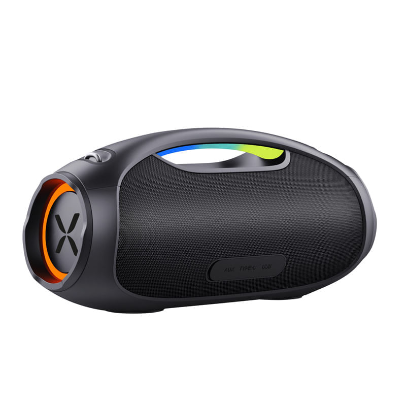 Parlante portatil inalambrico. Potencia de salida 60 W. Conexion Bluetooth V5.3. Sistema TWS. Resistente al agua IPX6. Bateria interna recargable (8 horas de duracion). 2 subwoofer + 2 tweeter. Entrada auxiliar 3.5mm. Luces RGB. Control manos libres para llamadas. Google assistant y Siri voice.