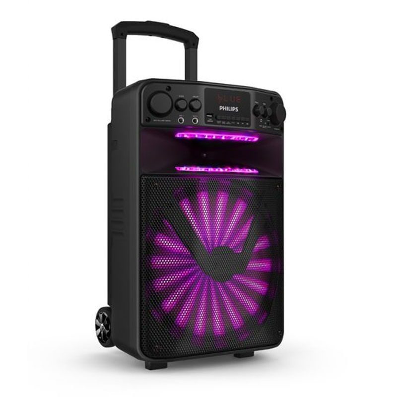 Parlante portatil. Potencia de salida 40W (RMS). Alimentacion 220v - Bateria. Display. Bluetooth. USB solo para carga. Entrada para microfono. Ruedas. Manija. Entrada auxiliar. 7 Horas de tiempo de reproduccion. Sonido alto y potente. Luces ritmicas. 2 Entradas de microfono de 6.3mm. Funciones de karaoke: eco, retardado, atenuador de voz. 1 Woofer de 12\". Hasta 10 m de alcance inalambrico. Botones para efectos vocales, modo de luz, pista/reproducir/pausa. Controles en el parlante para microfono, eco/retardado, ecualizador y volumen. Mango de transporte y ruedas integrados. Reproduci musica a traves de bluetooth y AUX. Entrada de audio (3,5mm). Potencia de salida: 40W (maximo). Potencia (RMS y THD%): 20W (RMS) 60 db. Accesorios incluidos: Adaptador de alimentacion de CA, Guia de inicio rapida.