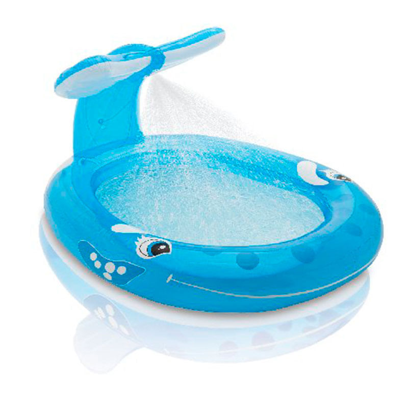 Pileta Inflable Intex infantil con forma de ballena. La pileta mide 208x157x99 cm y tiene capacidad para 269 litros de agua. La pileta esta fabricada de vinilo resistente de larga duracion. Dispone de conexion a una manguera de jardin para dispersar agua por la pileta a traves de la aleta trasera de la ballena. La pileta es de color azul y con lineas blancas que Simulan la boca y los ojos de la ballena. La pileta de ballena esta disenada para su uso a partir de los 2 anos de edad. Incluye kit de parches para reparar pequenos pinchazos o poros.