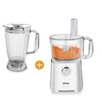 Multiprocesadora + Jarra licuadora. Potencia 650 W. 2 Velocidades. Boton pulsador. Capacidad del bowl 1.2L. Capacidad del vaso licuador 1.8L Accesorios cuchilla acero inoxidable, amasador, rebanador, rallador, procesador de verduras, exprimidor y emulsionador. Pica, ralla, rebana, tritura, amasa. exprime. Tipo de cuchillas acero.