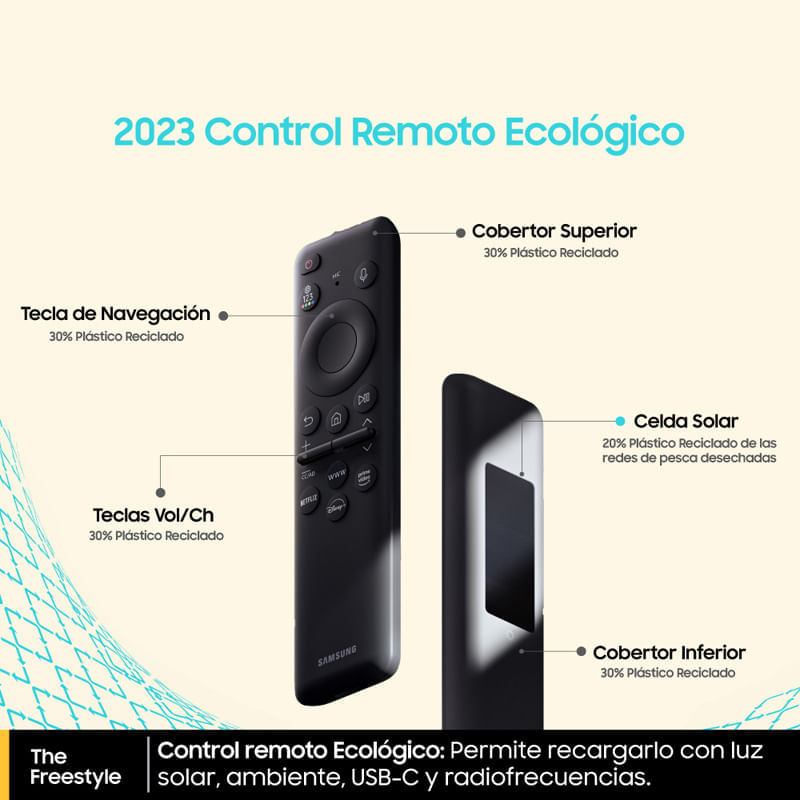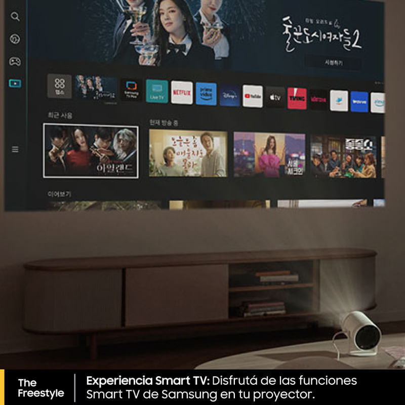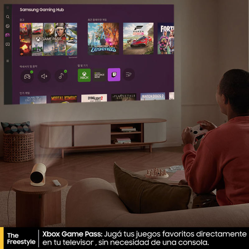 Proyector. Smart LED. Diseno compacto: Ligero y facil de transportar. Diseno integral: Proyeccion ajustable en 180 para tus contenidos favoritos. Resolucion 1920 X 1080 px. Rendimiento cinematografico: Proyecta de 30 a 100 pulgadas en calidad FHD. Brillo maximo: 230. Contraste HDR10. Ajuste automatico: Ajuste y optimizacion automaticos de la pantalla para corregir las imagenes distorsionadas. Experiencia smart TV: Disfruta de las funciones smart TV de samsung en tu proyector. Duracion de lampara: 20.000 hs. Parlantes incorporados. Sonido premium 360: Con 5W de potencia, sonido envolvente en todas direcciones. Frecuencia de barrido 60 Hz. Sistema operativo: Tizen. Wifi. Bluetooth. 1 HDMI. Auto enfoque. Auto keystone. Auto nivelacion. Xbox game pass: Juga tus juegos favoritos directamente en tu televisor, sin necesidad de una consola. Smart edge blending: Combina dos the freestyle y maximiza tu experiencia de cine en casa. Control remoto ecologico: Permite recargarlo con luz solar, ambiente, USB-C y radiofrecuencias. Incluye: Control remoto ecologico y cable de alimentacion.