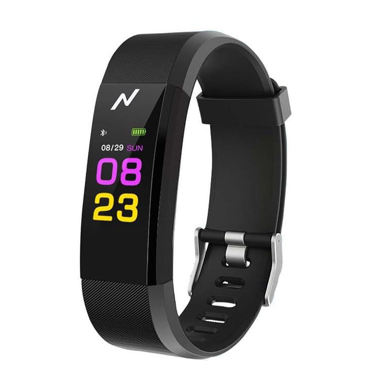 Pulsera Smart. Bluetooth. Sensor de muneca p/ monitorear act. fisica: ritmo cardiaco, temperatura corporal. calorias, cantidad de pasos, distancia recorrida. Chequeo de notificaciones. Alarma. Bateria Litio 80 mAH. Recarga por USB. Tiempo de recarga 2hs.