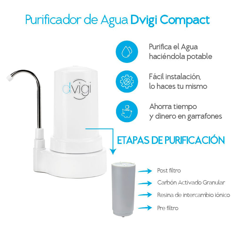 Purificador de agua blanco + 1 repuesto. Utiliza un sistema de filtracion de 3 etapas para eliminar las impurezas del agua. 1era etapa: elimina las particulas grandes como arena, oxido y suciedad. 2da etapa: elimina el cloro, los productos quimicos y el mal sabor y olor del agua. 3era etapa: asegura que el agua purificada tenga un sabor fresco y agradable. Material del cuerpo principal y carcasa: ABS. Rendimiento de cada filtro 7000 litros. Vida util de cada filtro 9 meses. Capacidad/ caudal: 2 litros por minuto. Tipo de filtro: Carbon activado impregnado en plata pura en estado coloidal y resinas de intercambio ionico. Tipo de montaje: Sobremesa. Tipo de valvula: A rosca. Facil Instalacion y mantenimiento, directo al cano de la canilla. Incluye: Valvula de doble via para poder alternar entre la canilla y el agua pura. Manguera atoxica de grado alimenticio. Kit de adaptadores estandar: 5 Adaptadores rosca interna de diferentes medidas, para diferentes tipos de canillas. + 1 Adaptador para canillas sin rosca, adaptador de goma.