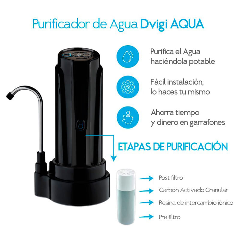 Purificador de agua negro + 2 repuestos. Utiliza un sistema de filtracion de 3 etapas para eliminar las impurezas del agua. 1ra etapa: elimina las particulas grandes como arena, oxido y suciedad. 2da etapa: elimina el cloro, los productos quimicos y el mal sabor y olor del agua. 3era etapa: asegura que el agua purificada tenga un sabor fresco y agradable. Material del cuerpo principal y carcasa: ABS. Rendimiento de cada filtro: 14000 L. Vida util de cada filtro: 18 meses. Capacidad/ caudal: 2 L por minuto. Tipo de filtro: Carbon activado impregnado en plata pura en estado coloidal y resinas de intercambio ionico. Tipo de montaje: Sobremesa. Tipo de valvula: A rosca. Facil Instalacion y mantenimiento, directo al cano de la canilla. Incluye: Valvula de doble via para poder alternar entre la canilla y el agua pura. Manguera atoxica de grado alimenticio. Kit de adaptadores estandar: 5 Adaptadores rosca interna de diferentes medidas, para diferentes tipos de canillas. + 1 Adaptador para canillas sin rosca, adaptador de goma.