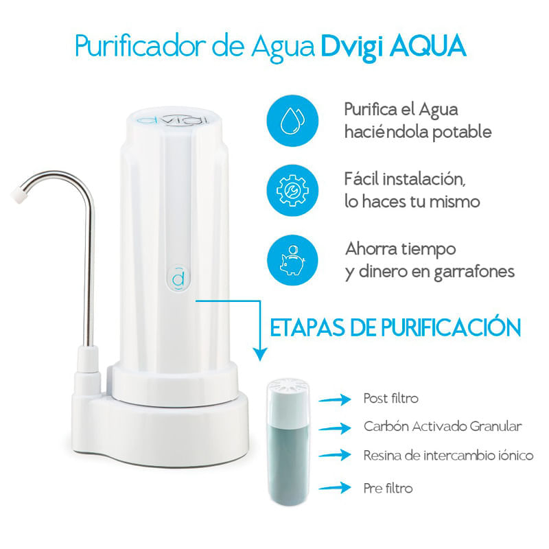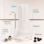 Purificador de agua blanco. Utiliza un sistema de filtracion de 3 etapas para eliminar las impurezas del agua. 1ra etapa: elimina las particulas grandes como arena, oxido y suciedad. 2da etapa: elimina el cloro, los productos quimicos y el mal sabor y olor del agua. 3era etapa: asegura que el agua purificada tenga un sabor fresco y agradable. Material del cuerpo principal y carcasa: ABS. Rendimiento de cada filtro: 14000 L. Vida util de cada filtro: 18 meses. Capacidad/ caudal: 2 L por minuto. Tipo de filtro: Carbon activado impregnado en plata pura en estado coloidal y resinas de intercambio ionico. Tipo de montaje: Sobremesa. Tipo de valvula: A rosca. Facil Instalacion y mantenimiento, directo al cano de la canilla. Incluye: Valvula de doble via para poder alternar entre la canilla y el agua pura. Manguera atoxica de grado alimenticio. Kit de adaptadores estandar: 5 Adaptadores rosca interna de diferentes medidas, para diferentes tipos de canillas. + 1 Adaptador para canillas sin rosca, adaptador de goma.