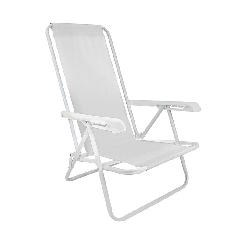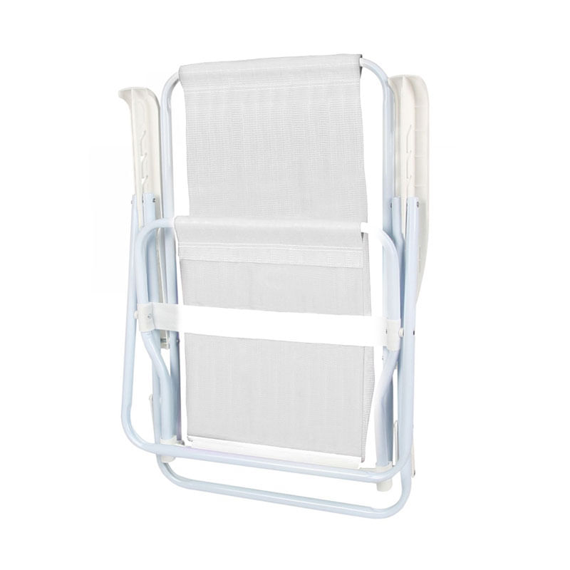 Reposera de 4 posiciones. Medidas: 73,5 x 54 x 83,5cm. Peso: 2,58Kg. Material - Composicion: Acero 79,53%, tela 5,82%, plastico 14,65%. Estructura en tubos de acero pintado. Tela 100% poliester con revestimiento en PVC. Color: blanco