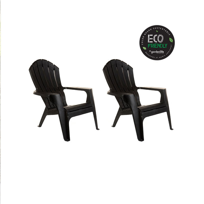 Set de 2 sillones miami ecologicos color negro. Banco de plastico modelo miami negro con textura simil madera, su respaldo ergonomico brinda comodidad y confort, disenado para ser utilizado al exterior por su durabilidad y resistencia a los factores externos. El sillon miami ecologico esta fabricado con polipropileno reciclado. Medidas de los sillones (alt-anch-prof) 91x83x74.5 cm. Alto del piso al asiento del sillon 26cm. Peso del sillon 6kg. Soporta 120kg. Faciles de limpiar. Resistente a rayos uv. Productos elaborados para que no danen el ambiente.