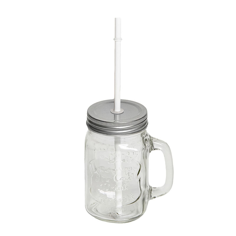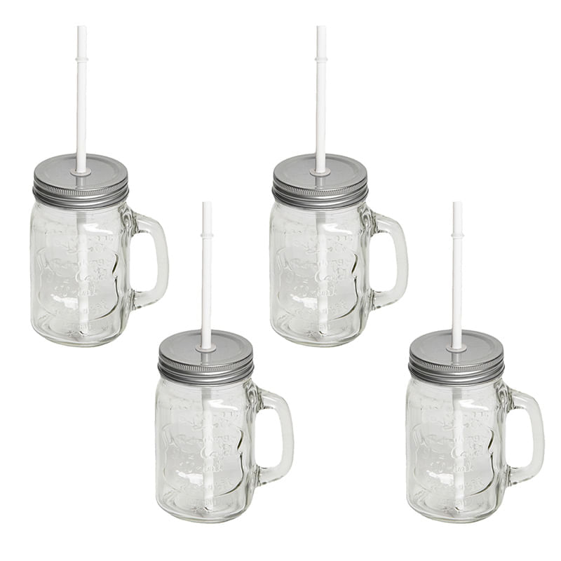 Set de 4 jarros de vidrio con sorbete y tapa de plata. Capacidad: 450 ml.