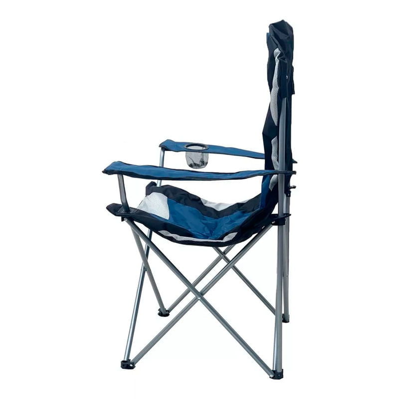 Sillon deportivo. Plegable. Confeccionado en nylon reforzado 800D. Respaldo acolchonado. Porta vaso lateral. Estructura de acero. Apto 120 Kg acolchado. Bolso cerrado 96cm de largo por 17cm ancho. Incluye funda de transporte. Peso 3,5 kg.