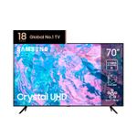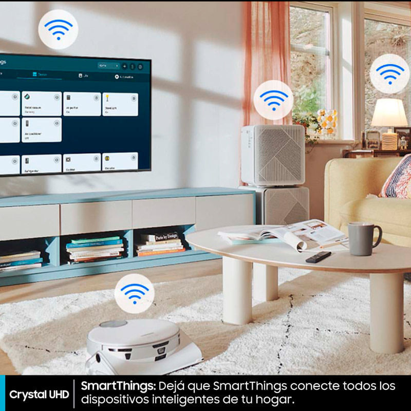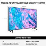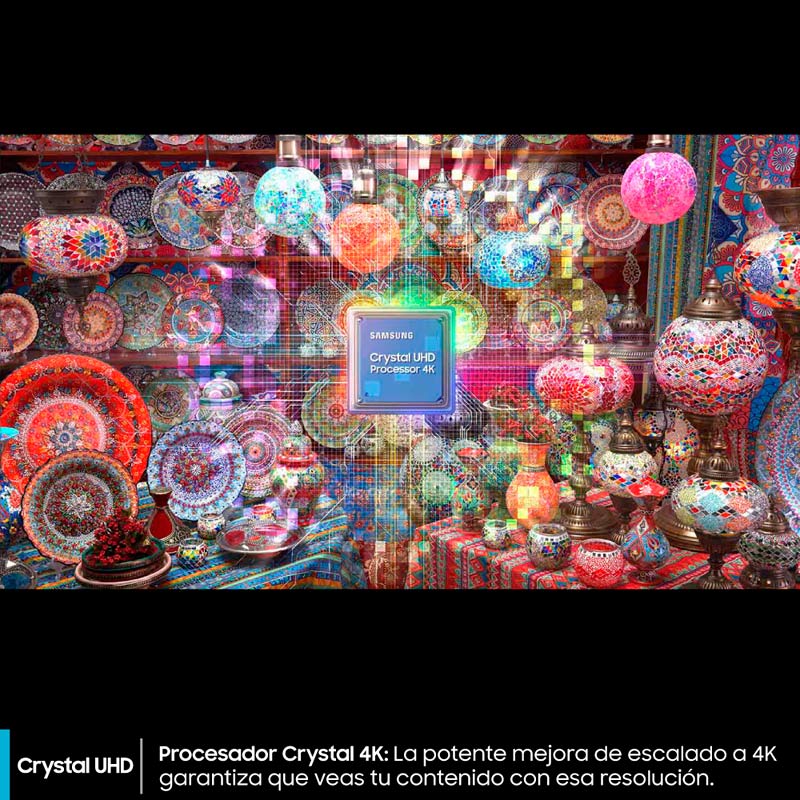 Televisor smart LED. Pantalla de 70\" UHD 4K (3.840x2.160). Formato de pantalla: WIDE. Frecuencia de actualizacion: 50 Hz. Procesador: Crystal Processor 4K. Salida de audio. Sonido Dolby Atmos. Potencia de 20 W (RMS). Sonido adaptativo. Conexiones: WiFi5. Bluetooth 5.2. 3 HDMI. 1 USB. Ethernet (LAN). Salida de audio digital (optica). Entrada RF (Entrada terrestre / cable). Sintonizador TDA. Soporte VESA 400x300 mm. Purcolor: Colores increibles para una imagen vibrante. Potenciador con contraste HDR+10: Nuevo nivel de profundidad y color gracias al analisis de cada imagen. SmartThings: Conecta todos los dispositivos inteligentes de tu hogar. Q-Symphony: Combina el sonido de tu TV con tu barra de sonido para disfrutar de todos a la vez. Xbox game pass: Juga sin necesidad de consola solo conectando un mando Bluetooth. Medidas con base (alt-anch-prof): 97.62x155.62x34.11 cm. Incluye: Cable de alimentacion y control remoto.