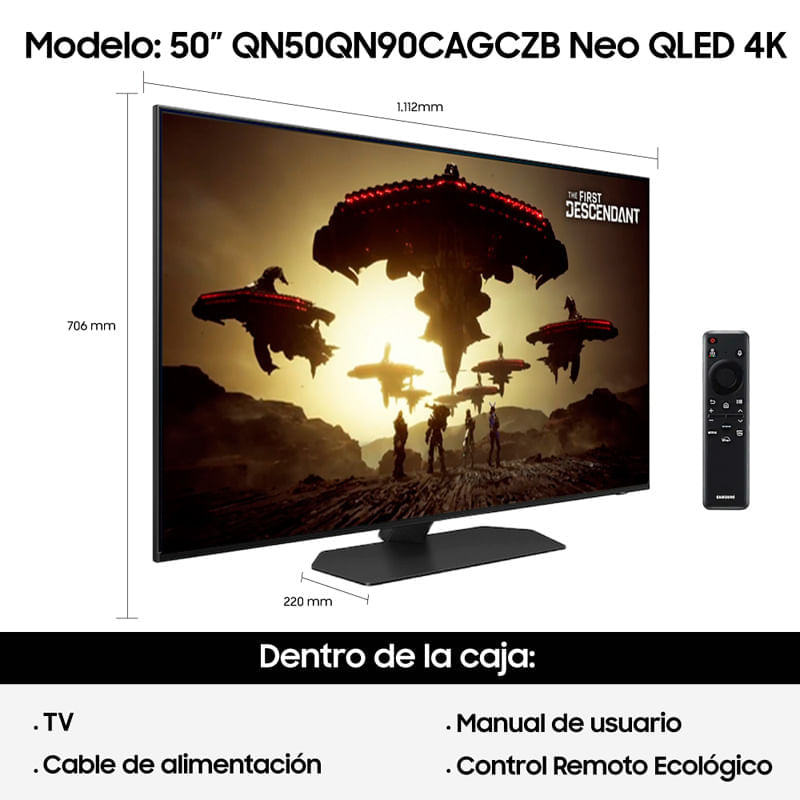 Televisor Neo QLED gaming. Pantalla de 50\" Resolucion 4K 3840 x 2160. Formato de pantalla Wide. Frecuencia de barrido 120 Hz. Salidas de audio. Potencia RMS 40W. Conexiones: Wi Fi. Bluetooth. Entrada video componente. Entrada video compuesto. 2 USB. 4 HDMI. Sintonizador TDA. Contraste dinamico HDR. Entrada para PC (HDMI).
