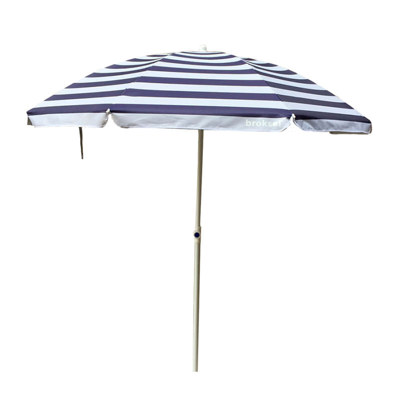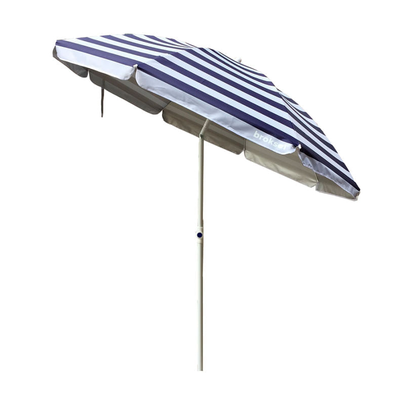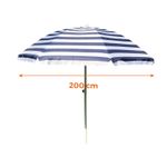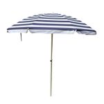 Sombrilla playera. Color: Rayado blanco y azul. Cano de zinc 32 mm. Tejido interior: poliester aluminizado. Tejido exterior: 100% poliester. PE (Polietileno). Reclinable hacia ambos lados. Con funda de transporte.