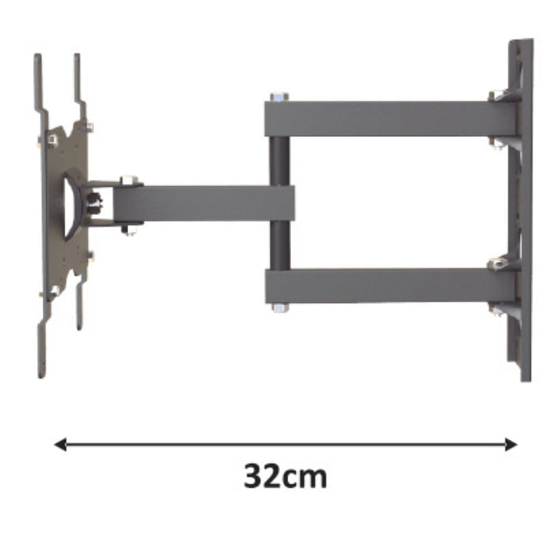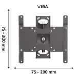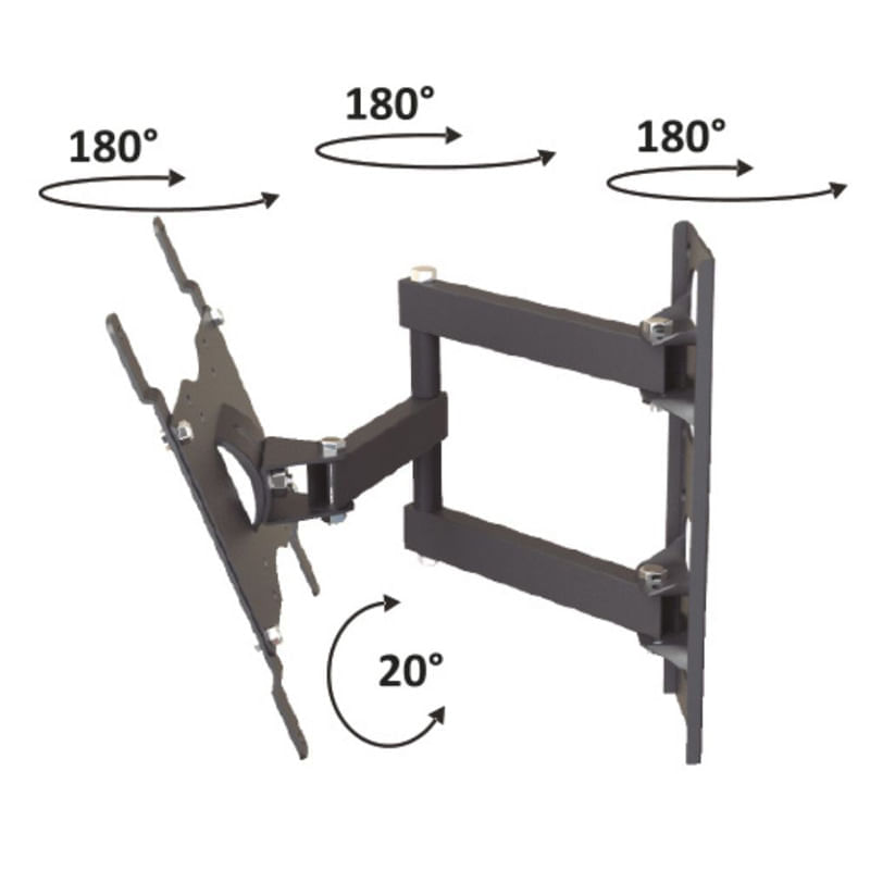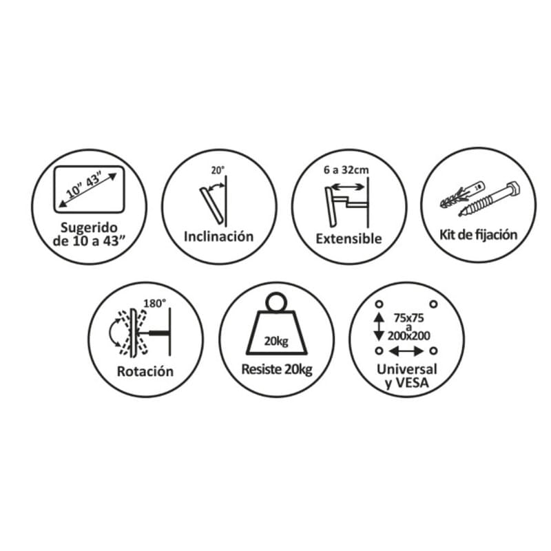 Soporte TV LED movil. Este soporte extensible giratorio y con inclinacion ofrece una solucion practica y versatil para la instalacion de pantallas de 10 a 43 pulgadas, brindando flexibilidad y comodidad en la disposicion de dispositivos audiovisuales en el hogar u oficina. Construccion resistente y de facil instalacion. Inclinacion: 20 grados. Rotacion: 180 grados. Resiste: 20kg. Universal y VESA: 75x75 a 200x200. Distancia a pared: 6 a 32 cm. Incluye kit de fijacion.