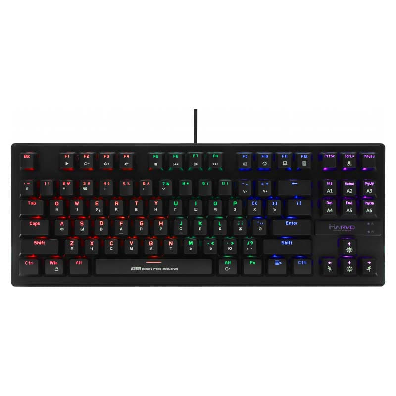 87 Teclas. Tipo de interruptor: mecanico (azul). Clasificacion del interruptor: = 50 millones de prensas. Ruta clave: 3,8 0,4 mm. Fuerza de funcionamiento: 60 10 g. Luz de fondo: arco iris de 6 colores. Interfaz: USB 2.0. Longitud del cable: 1,6 m. Soporte de sistema operativo: Windows 7 o mas reciente. Diseno compacto con un marco delgado y diseno TKL. Anti-ghosting completo: soporte de reinversion de teclas N. Mas de 20 esquemas de iluminacion seleccionables. Cinco teclas macro programables sin controlador (del 1 al 5). Diseno resistente: placa frontal de metal y ABS de alta calidad. Software de personalizacion avanzado.