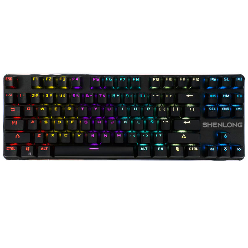 Teclado Gamer. Conexion USB. Disenio de 87 teclas. Cubierta superior de metal / parte inferior de ABS. Switches mecanicos blue. 50 millones de clics. idioma espanol. 26 teclas antighosting. Iluminacion Rainow con 9 modelos de colores. Teclas multimedia: FN + F1 - 12. Cable de 1.5mts de largo con anillo magnetico. Voltaje de funcionamiento: USB 5V.